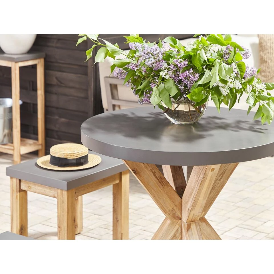 Moderne tuintafel van vezelcement en acaciahout. Geef je tuin meer sfeer met deze eettafel, die het dineren met familie en vrienden zoveel leuker maakt. Het tafelblad is perfect voor buitengebruik, omdat het gemakkelijk te reinigen en te onderhouden is en bestand is tegen verschillende weersomstandigheden. De poten zorgen voor de nodige stevigheid en vormen een opvallend contrast met het blad. Deze tafel past zeker in een modern of minimalistisch ingerichte tuin.