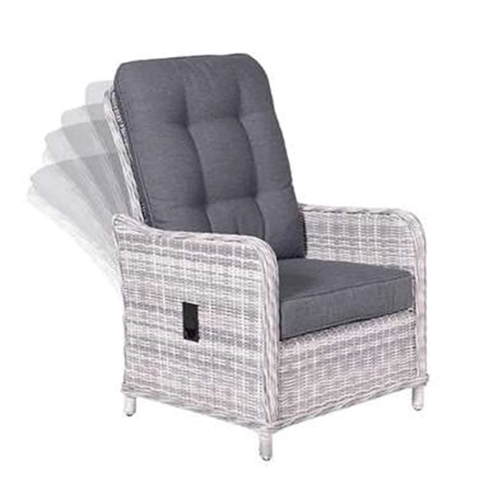 Heerlijk wegdromen kun je zeker in de Nova verstelbare tuinstoel. Met deze stoel kun je alle kanten op. Of je nu een goed boek wilt lezen, lekker wilt zonnen of gewoon buiten dineren, het kan allemaal! De Nova verstelbare stoel wordt compleet geleverd met dik zit- en rugkussen. Dat je heerlijk kunt wegdromen in deze stoel, dat zie je direct, maar deze stoel is daarnaast ook vervaardigd uit hoogwaardige kwaliteit materialen. De stoel is vervaardigd uit een onderhoudsvrij aluminium frame en weerbestendig half rond wicker kunststof vlechtwerkdraad in de kleur cloudy grey. Het draad heeft een dikte van maar liefst 5mm, wat zorgt voor een robuuste uitstraling. Wicker is een stevig en duurzaam kunststof, waardoor je jarenlang kunt genieten van de Nova verstelbare tuinstoel. Het zit- en rugkussen is gemaakt van een hoogwaardige kwaliteit polyester. Het zitkussen is voorzien van een rits, waardoor het hoesje gemakkelijk met de hand gewassen kan worden. De rugkussens zijn voorzien van extra stiksels waarmee de stof op twee plekken naar elkaar wordt getrokken, wat zorgt voor een klassieke uitstraling. Deze stijlvolle look is geïnspireerd op de bekende klassieke chesterfield banken. De kussens zijn niet 100% waterdicht, maar zijn wel voorzien van een waterafstotende coating. Dit is vooral erg praktisch als er bijvoorbeeld op het kussen wordt gemorst met drinken. Je veegt het vocht er namelijk gemakkelijk weer af. Na gebruik kunnen de kussens opgeborgen worden in de schuur of een mooie kussenbox. Deze Nova stoel is traploos verstelbaar (d.m.v. een gasveer), waardoor je gemakkelijk de rugleuning in iedere gewenste positie kunt zetten. Op deze manier kun je met deze stoel ook heerlijk in de zon liggen. Combineer de stoel bijvoorbeeld met het Nova krukje en je ligt helemaal heerlijk. De verstelbare Nova stoel kun je los aanschaffen, maar past ook perfect bij de andere tuinmeubelen uit de Nova serie. Zo combineer je deze stoel bijvoorbeeld met de Nova dining tafel of met een complete hoekbank opstelling. De Nova meubels zijn leverbaar in diverse kleurstellingen. De afmetingen van deze stoel zijn: B 72 x D 78 x H 85 cm.