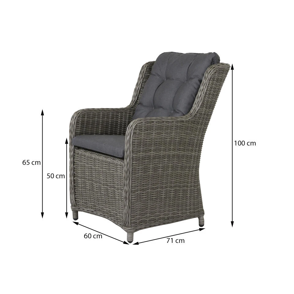 De Richmond tuinstoel heeft een grijs vlechtwerk wat ervoor zorgt dat deze bij iedere tafel gecombineert kan worden. De antraciet kussens van de dining tuinstoel maken de set tot een geheel. De stoel zit erg lekker door de ideale zithoogte en de comfortabele zit en rugkussens.