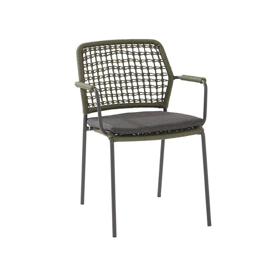 De Barista dining fauteuil van het kwaliteitsmerk 4 Seasons Outdoor is een prachtige tuinstoel gemaakt van een RVS frame met rope. Door dat er gebruik gemaakt is van groen rope krijgt de tuinstoel een speelse uitstraling. Deze kan goed gecombineerd worden met een robuuste tuintafel. Barista dining fauteuil is gemaakt van roestvrij stalen frame. In dit frame is prachtig rond rope gevlochten wat zorgt voor een modern design. Het materiaal van de Barista tuinstoel is erg sterk, onderhoudsvriendelijk, en zal niet roesten. Let op! Dit rope is speciaal ontworpen voor buitengebruik. Het rope heeft een binnen kern van polypropyleen en een buitenkern van Olefin. Deze combinatie zorgt ervoor dat het rope water en vuil afstotend en schimmelwerend is. Het rope heeft een hoge UV bescherming en de stof wordt niet warm in de zon. Dit zorgt ervoor dat je prettig kunt zitten in de zon. De Barista dining stoel wordt inclusief comfortabele all-weather zitkussen geleverd. het kussen kun je gerust het gehele zomerseizoen buiten laten liggen. De speciale outdoor Olefin stof zorgt ervoor dat het water dwars door het kussen loopt en dat het kussen zijn vorm behoud. Het kussen is bestand tegen alle weersomstandig. Daarnaast is het kussen ook voorzien van een rits. De tuinstoel heeft een afmeting van 59 bij 58 cm en is 80 cm hoog.